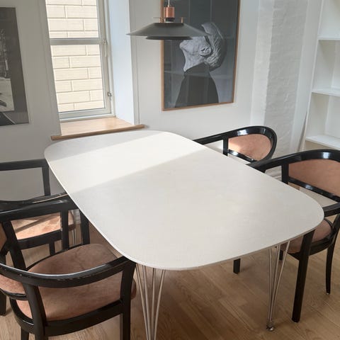 Der er to hak i kanten af marmoren (se billeder), men bordet er fuldt funktionelt og stabilt. Skaderne kan lappes professionelt, hvis man ønsker det – ellers kan de ses som en del af patinaen.