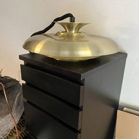 Fed messing ‘rørlampe’ med hvid stofledning. Kommer fra ikke rygerhjem. Ingen ridser mm