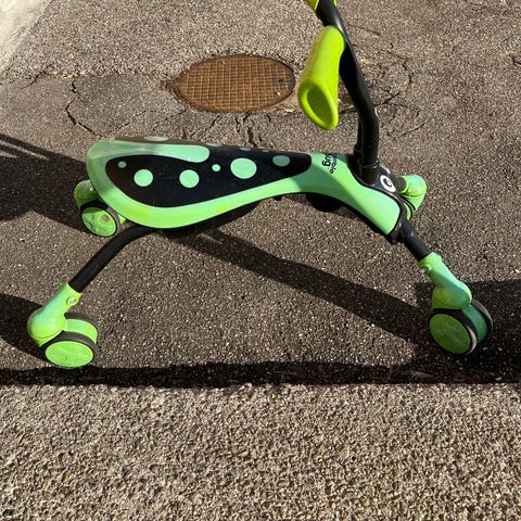 Razor Sparkesykkel med lilla håndtak og hvit ramme. Sparkesykkelen har en robust konstruksjon med ståldeler og et bredt fotbrett. Den er designet for barn og unge og egner seg til utendørs bruk på asfalt og betong.