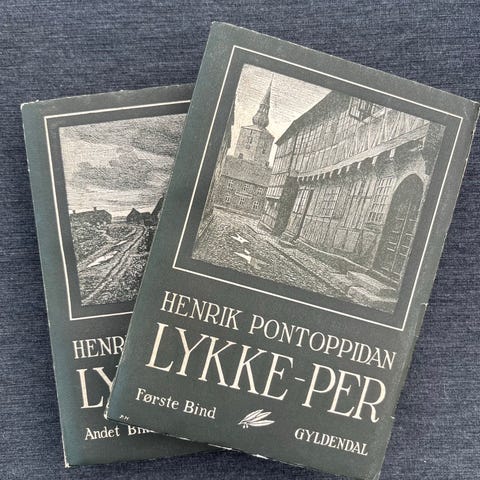 Lykke-Per 1+2 (komplet). Af Henrik Pontoppidan. Indbundet udgave med smudsomslag. Komplet i 2 bind. Gyldendals bibliotek,1980. Fejlfri stand.