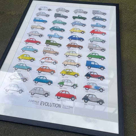 sjov og inspirerende plakat med den vidunderlige citroën mahari's historie fra første model i 1968 og til sidste i 1987. talt 40 forskellige modeller afbildet. plakaten er smukt indrammet med syrefrit passepartout og ægte sort træramme. måler 61x83 cm med ramme