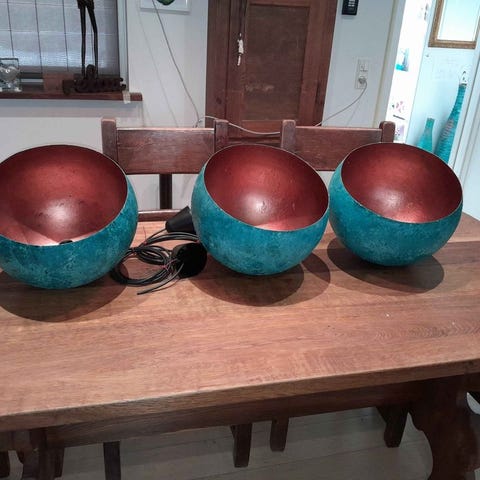 1 stk Globe Ø25 pendel - Håndmalet i irgrøn/turquoise og med 5 pct kobbergennemtræk på ydersiden og med patineret kobbereffekt indeni.