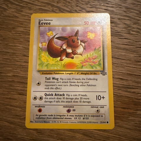 Pokémon Eevee VMAX samlekort med holografisk finish. Kortet har en størrelse på standard Pokémon-kort og viser Eevee i VMAX-form. Passer til samlere og spillere af Pokémon kortspil.