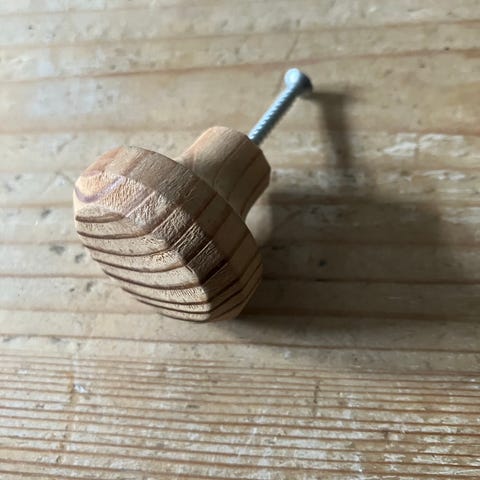Restlager fra nedlagt møbelfabrik Skuffegreb i træ med skruehuller.