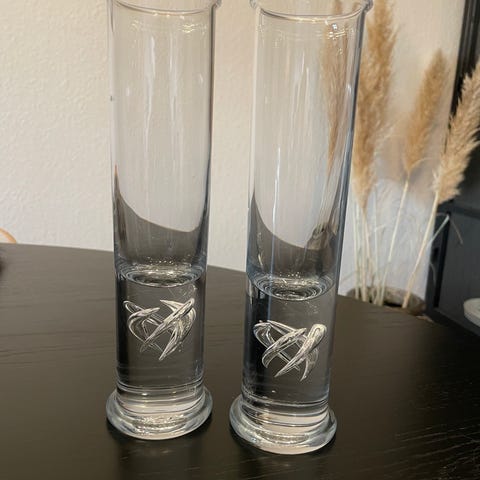 Det måler ca. 16 cm I højden. Der står to på næstved Museum mage til. De blev udført på bestilling af Holmegaard, fra vinfirmaet