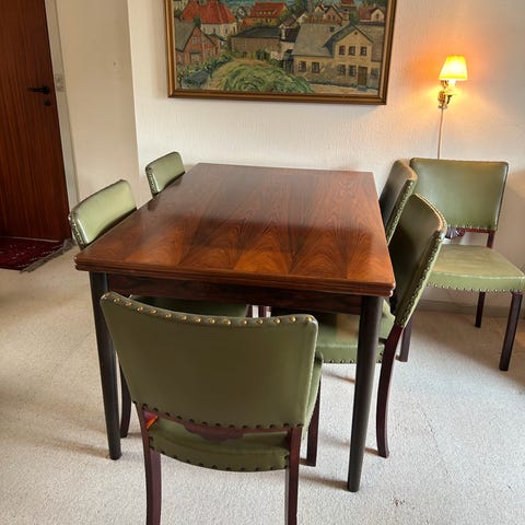 Pænt sæt med ægte læderstole og med hollandsk udtræksbord i højtrykslaminat 95x180/280cm nypris 18750kr