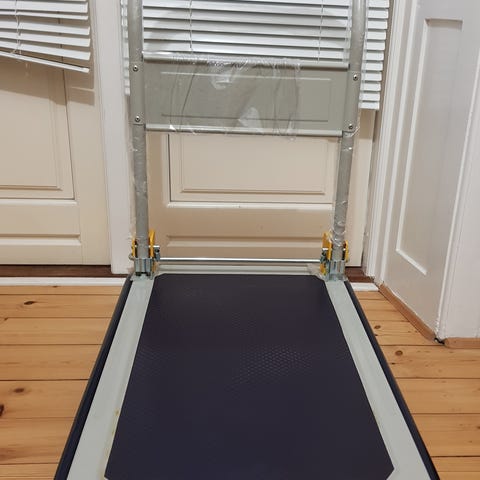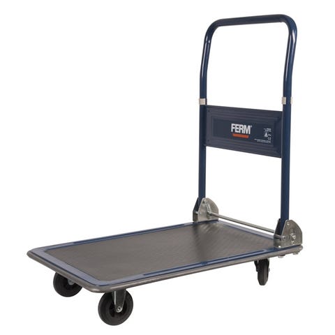 Lomax Mini Mover transportvogn med skridsikker belægning og beskyttende stålafgrænser. Velegnet til håndtering og transport af varer. Robust konstruktion med fokus på sikkerhed under brug.