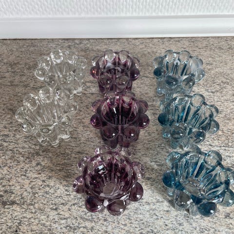 Iittala glas lysestager i forskellige farver inklusive blå, grøn og klar. Materialet er glas, og størrelserne varierer let. Lysestagerne er designet til at holde små lys eller fyrfadslys og kan bruges som dekoration eller til belysning i hjemmet.. pris er per styk.