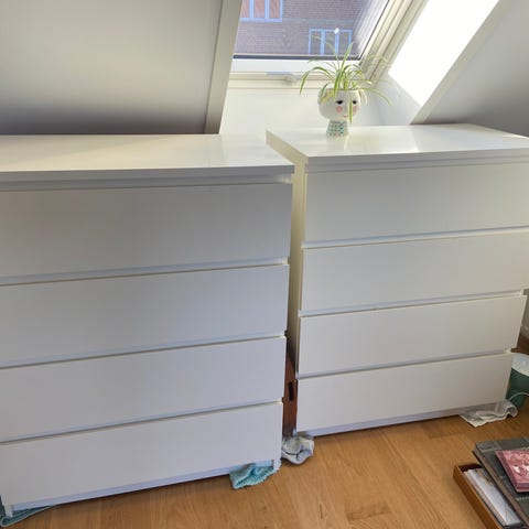 Sælger to ens, hvide kommoder fra IKEA. Kommoderne er separate møbler, men har stået samlet hos os (som vist på billedet). De kan naturligvis placeres hver for sig og passer fint ind i de fleste rum.