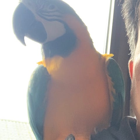 Gulkindet amazon papegøje 1,0 (avls papegøje) danskopdrættet fra 2003, tillidsfuld, tager godbid fra hånden, er sød og rolig.