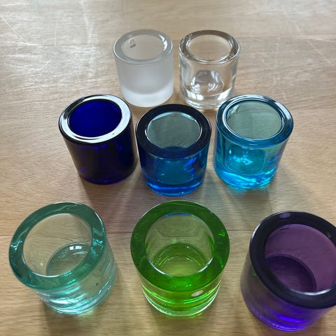 Iittala glas lysestager i blå farve. Sættet består af to lysestager med en cylindrisk form. Materialet er glas, og de har en dyb blå nuance. Velegnet til brug som dekorative elementer til stearinlys.