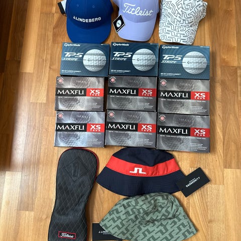 Emirates Golf Tees og golfbolde med tilbehør, herunder tees, bolde og en rød Emirates golfhåndklæde. Produkterne er i forskellige størrelser og materialer, velegnet til golfspillere.