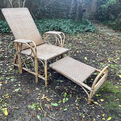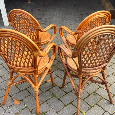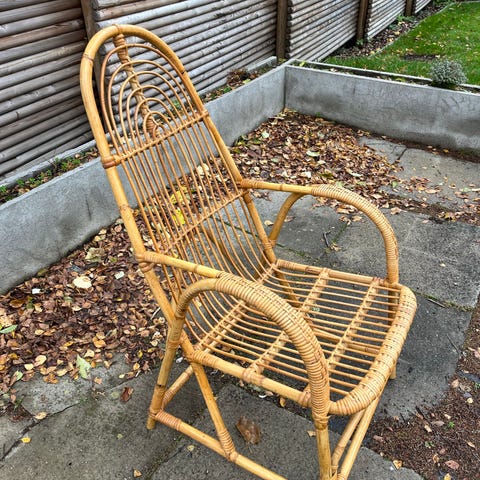 Vintage fletstol lavet i rattan med en mintgrøn farve. Stolen har en buet ryg og sæde, der giver støtte og komfort. Designet med flettede detaljer og en robust ramme. Velegnet til både indendørs og udendørs brug.
