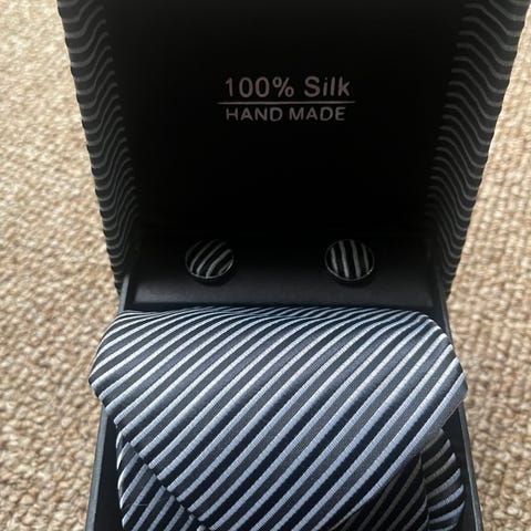 Sættet indeholder også et matchende lommetørklæde (pocket square) til brystlommen på jakkesættet samt manchetknapper, alt leveret i original gaveæske