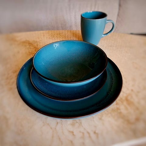 Blå spisestel købt I SuperBrugsen coop/Salling.