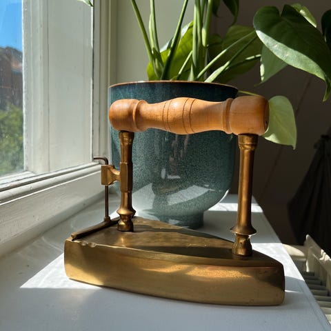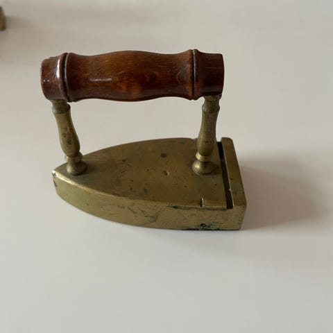 Fremstillet af messing og træ. Strømkilden er kul. Dette strygejern er velegnet til alle, der elsker vintageartikler, og det er også funktionelt!