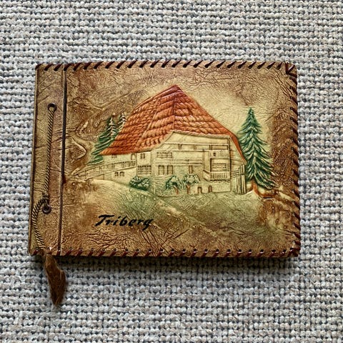 Fyldt, gammelt glansbilledalbum – rødt - usædvanlige billeder