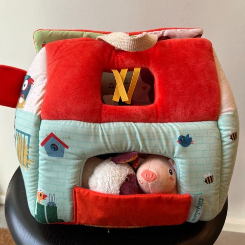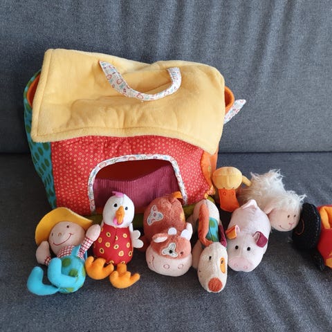 Den fineste lille bondegård af stof med forskellige stofbondegårdsdyr foruden landmand og traktor. Bondegården er også en lille kuffert, dyrene kan transporteres i.