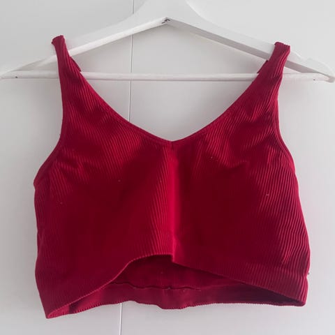 H&M Top i rød farve, størrelse 32 (xs kan umiddelbart også passe den). Toppen har et bånd ved taljen. Materialet er let.