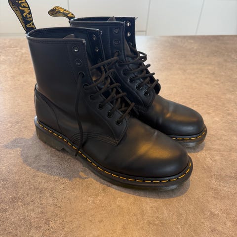 Dr. Martens støvler i sort læder, størrelse 40. Støvlerne har klassisk snørelukning med otte øjer på hver side og gummisål med karakteristisk mønster. Designet inkluderer gul syning langs sålen og trækstrop med logo bagpå. Materialet er holdbart læder, velegnet til daglig brug. Brugt et par gange.