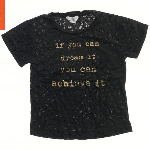 Blå T-shirt med kort ærme og et grafisk print på forsiden af en tropisk ø med tekst 'Greetings from a lonely island'. Bagsiden er uden print.