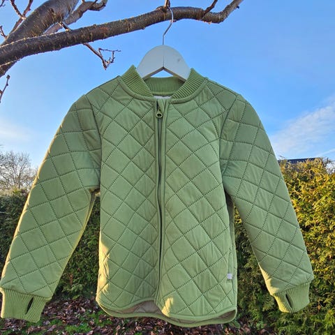 Lyserød termojakke til børn med lynlåslukning foran. Jakken har quiltet mønster og to lommer foran. Ribkanter ved håndleddene for en behagelig pasform. Designet er enkelt og funktionelt.