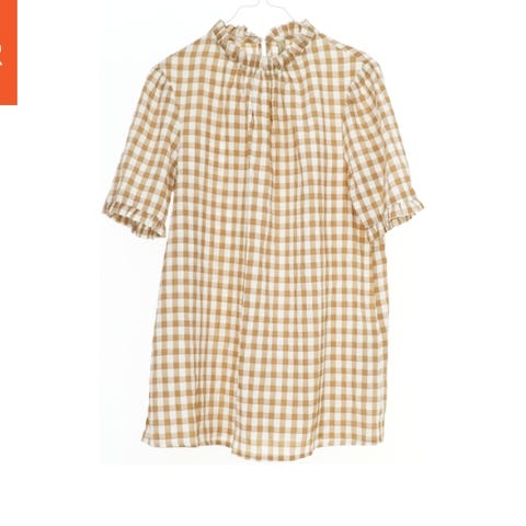 Kjolen er orange med et lyst mønster og har korte ærmer. Den har en rund halsudskæring og elastikdetaljer ved halsen. Bagpå findes en enkelt knaplukning.