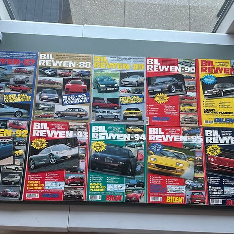 Bilen Bilrevyen sæt bestående af fem bilmagasiner fra årene 1990, 1991, 1992, 1993 og 1994. Magasinerne indeholder information om bilpriser, præstationer, vurderinger, samt fold-ud plancher med bilillustrationer. Hvert magasin dækker forskellige bilmodeller og tilbyder detaljerede tekniske data og sammenligninger.