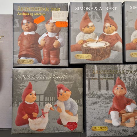 Stor samling med 33 æsker Trip Trap / Klarborg nisser og figurer. Alle i originalæsker. Standen er generelt god – kun én lille engel har tabt sin vinge (vingen medfølger. Kan limes på).