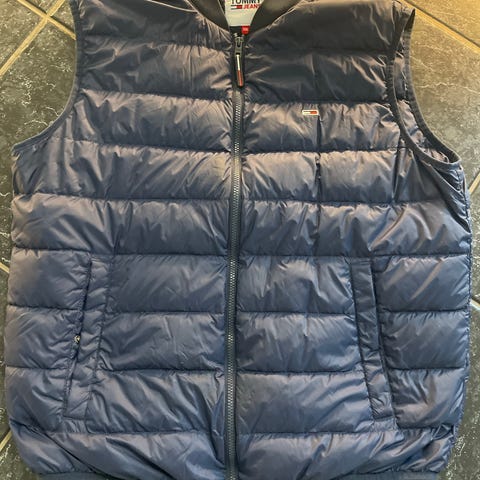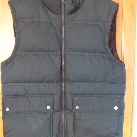 Tommy Hilfiger vest i størrelse M, farven grøn. Vesten er designet til mænd og egner sig til udendørs brug. Materialet er ikke specificeret, men vesten har en polstret, varmende konstruktion med lynlås og lommer.