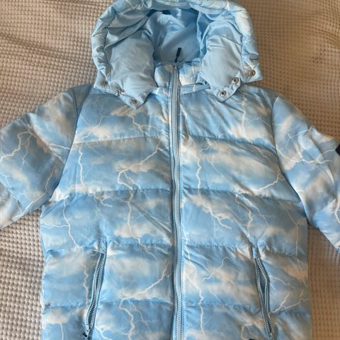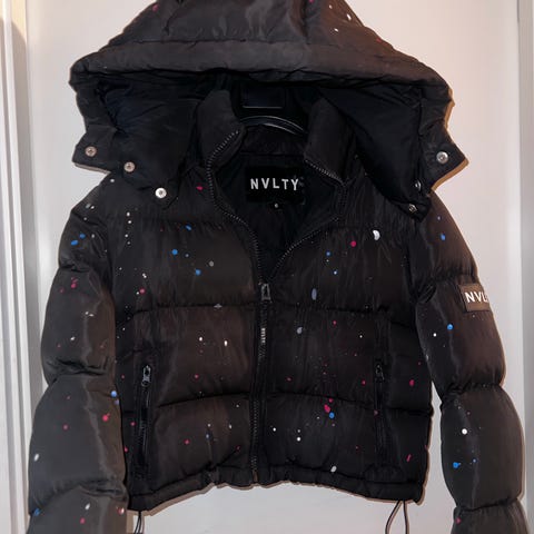 Hej sælger denne NVLTY jakke som jeg ikke har set nogen andre gå med i denne farve det er en super varm og komfortabel jakke som helt sikkert kommer til at gøre din vinter behagelig, som ses på de 2 sidste billeder er jakke blevet brugt en del den har en lille sprække under venstre armhule og mangler selve NVLTY mærket der sidder i den øverste af lynlåsene også derfor den lave pris men prisen er ikke fast så kom endelig med et bud😁