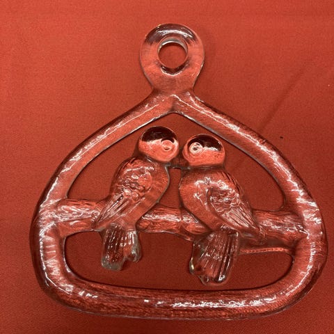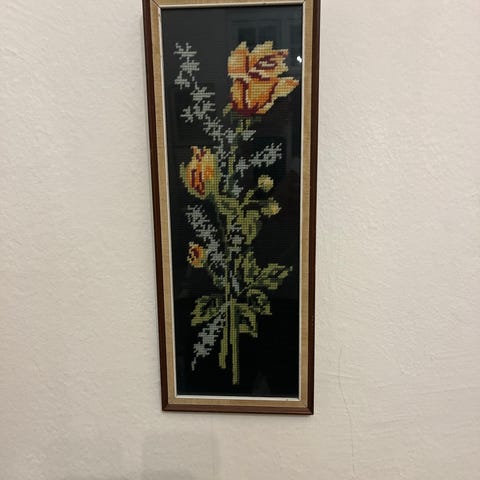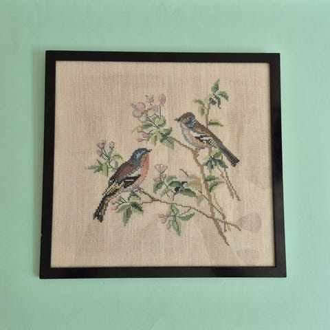 Flot og stemningsfuldt vægophæng med broderi og dekorative piber. Broderiet forestiller to fugle omgivet af slyngede ranker og blomster – et motiv der traditionelt symboliserer glæde, natur og livskraft. Farverne er klare, og udførelsen viser høj håndværksmæssig kvalitet.