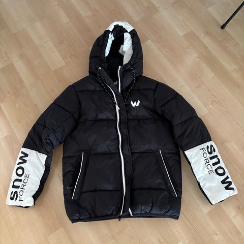 Jakken er kun brugt få gange og er stadig i super stand. Den er dejlig varm og let i materialet. Hætten er aftagelig, så den kan bruges både med og uden.
