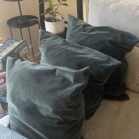 2 velour puder, B 75 cm, H 40 cm.