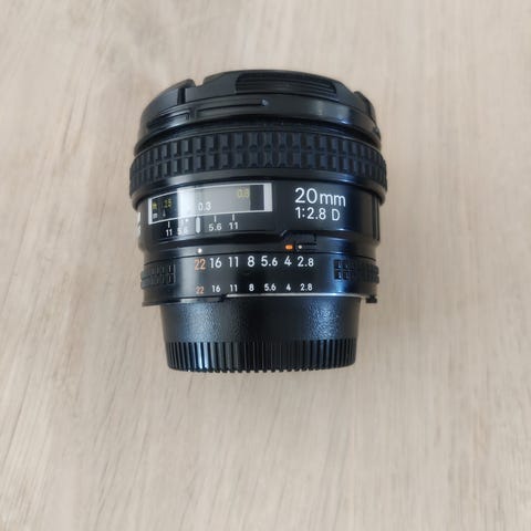 Nikon 20mm 1:2.8 kameraobjektiv med manuel fokus. Objektivet har en brændvidde på 20 mm og en maksimal blænde på f/2.8. Designet til brug med Nikon kameraer, egnet til fotografering med vidvinkelperspektiv. Objektivet er fremstillet af metal og glas og har en robust konstruktion.