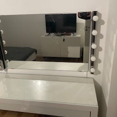 Udgået spejl.Med god lys.Den kan monteres på væg, eller som jeg brugte på bordet, stik er klar lige til at bruge. Købt for 2200 .