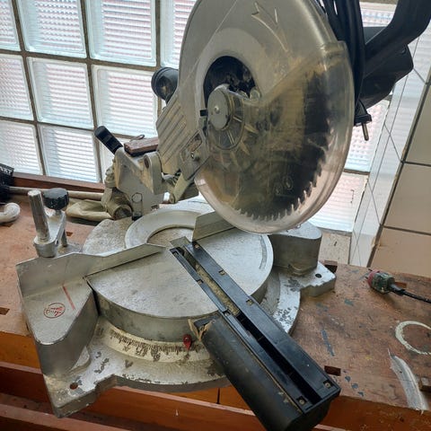 Korman KPM-2552 kap-/geringssav med blå og grå farve. Maskinen er designet til præcise snit i træ og andre materialer og har en drejelig base til geringssnit. Udstyret med et rundt klinge og håndtag til nem betjening. Saven fungerer fint, men sikkerhedsudløser for at løfte sav har sat sig fast. Den kan fikses uden større omkostninger med fingersnilde.