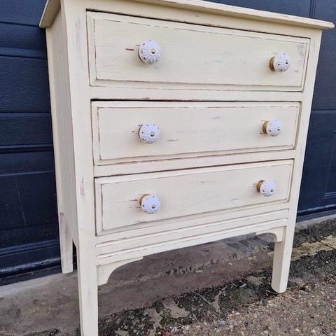 Sød gammel kommode, malet med kalkmaling og efterbehandlet med voks.