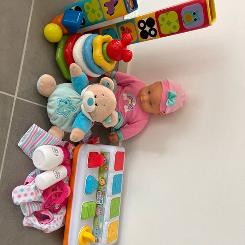 Fisher-Price til børn, består af flere farverige og forskellige dele. Legetøjet indeholder elementer med forskellige former og farver, designet til at stimulere sanserne. Passer til små børn og spædbørn.