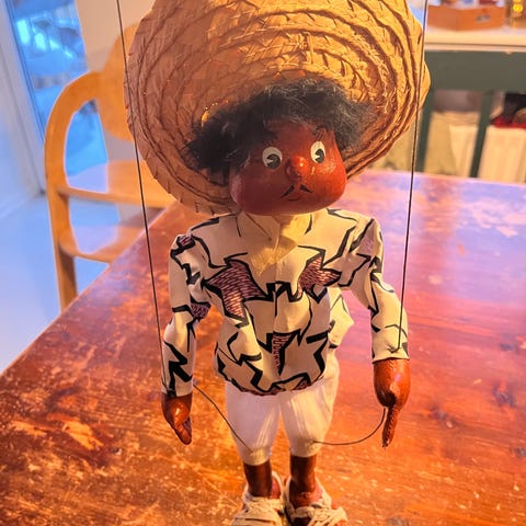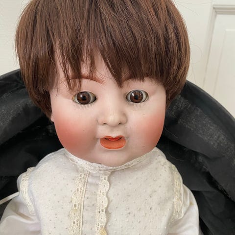 Dukke Jeanette fra Birgitte Frigast, 42 cm. Med certifikat og stativ. Dukkens hår chancerer lidt i farven. Er ikke egentligt falmet, har altid stået i skab uden direkte sollys.