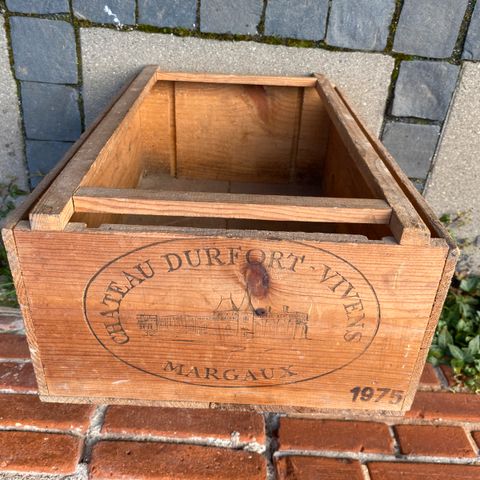 Kasse i træ måler ca 30-19-11 cm. Der står noget med Wine store.