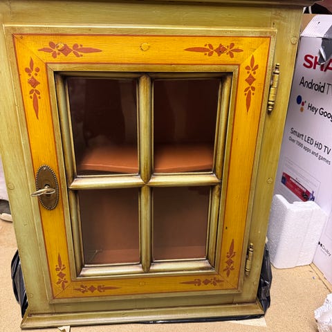 Vintage træ vægskab med glas på tre sider og glashylder Velegnet til opbevaring i hjemmet, eller udstilling i butik eller på marked - kan monteres på væggen for at spare plads. 48x40x60