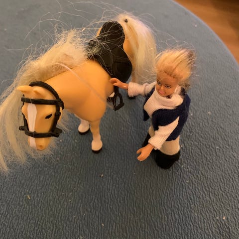 Lundby original retro, Brun hest med rytter og hjelm du må selv sætte selen på hesten alt som ses på billedet sælges samlet pris 75 kr jeg sender køber betaler fragt