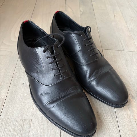 Hugo Boss sko i sort læder, størrelse 45. Skoene er komfortable og let brugte, men er fine uden ridser i læder. Førpris 2000. Afhentning eller sendes porto betalt.