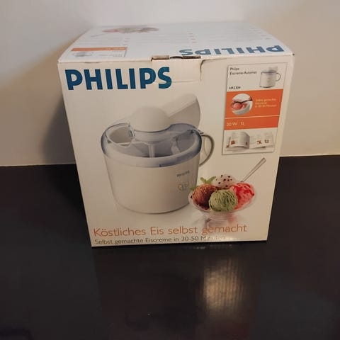 God og velfungerende Philips Delizia ismaskine med fryselement, som kan fryses seperat. Virkelig smart og nem at lave is på.