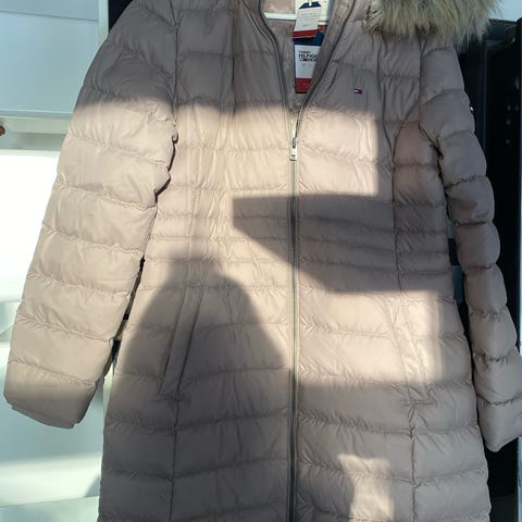 Tommy Hilfiger Hilfiger Denim frakke i sort farve, størrelse M til kvinder. Jakken er polstret og har en hætte. Materialet og designet er egnet til køligere vejrforhold.