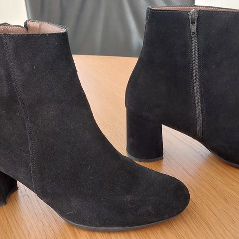 Spids snude. Chunky hæl. Lynlås på ydersiden. Næsten nye såler.