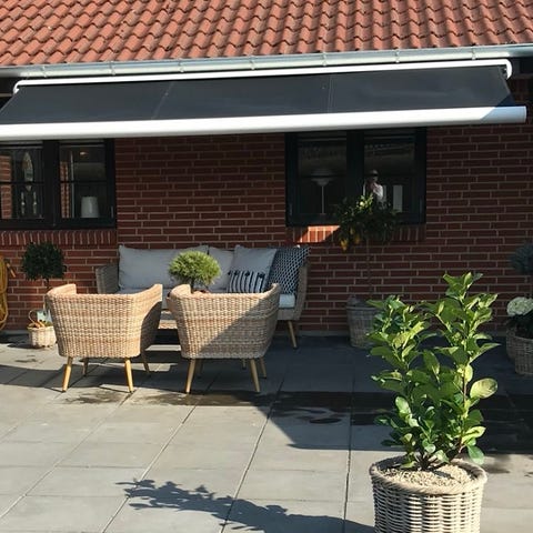 Markisen er i en lukket kassette.