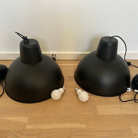 To stk skurup loftlamper i sort. Måler 19cm I diameter. Pærer medfølger.