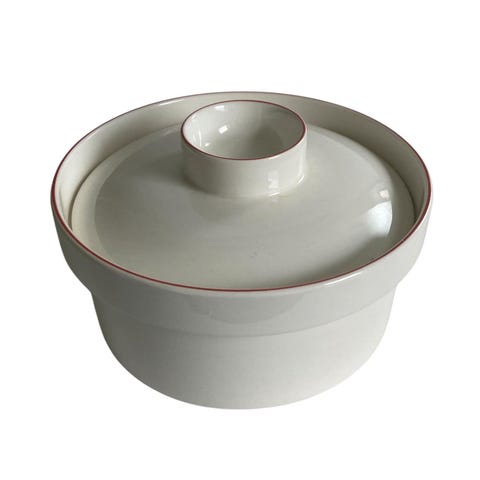 Royal Copenhagen Fajance rødtop lågskål designet af Grethe Meyer i fajance, cremefarvet med rød kant. Krukken har låg og er velegnet til opbevaring i køkkenet. Designet i klassisk stil med tydelig Royal Copenhagen mærkning under bunden. Model 3086. Diameter 21 cm, højde 12 cm.